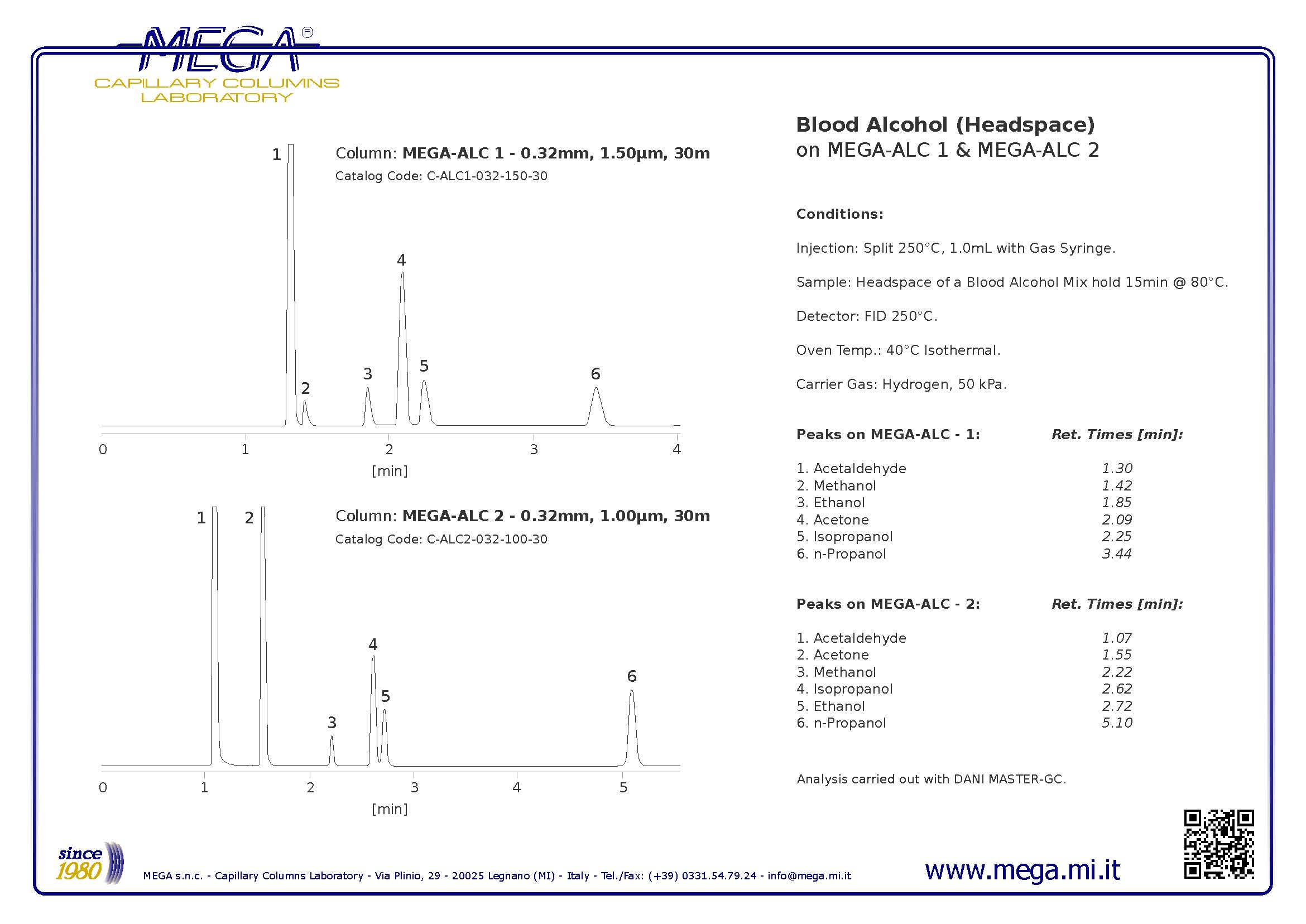 依據(jù)相關(guān)國家標(biāo)準(zhǔn)《中華人民共和國公共安全行業(yè)標(biāo)準(zhǔn):血液酒精含量的檢驗方法》(GA/T 842-2009)和《司法鑒定技術(shù)規(guī)范:血液中乙醇的測定 頂空氣相色譜法》(SF/Z JD0107001-2010)的規(guī)定,我們向您推薦使用具有30多年專業(yè)生產(chǎn)和研發(fā)石英毛細管柱的企業(yè)-意大利MEGA公司產(chǎn)品:MEGA-ALC2,其具有的特點: