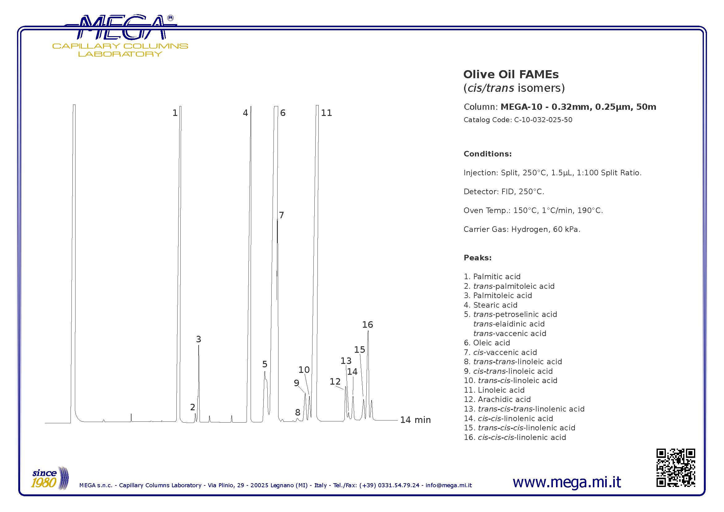 意大利MEGA公司(中文“美佳”)具有30多年專業(yè)生產(chǎn)和研發(fā)氣相色譜石英毛細(xì)柱的企業(yè),其產(chǎn)品之一MEGA-10毛細(xì)管柱可以滿足此標(biāo)準(zhǔn)的要求,規(guī)格:50m x 0.25mm 0.20um df,可以很好分離標(biāo)準(zhǔn)中規(guī)定的5種脂肪酸。與使用其它品牌100m x 0.25mm 0.20um df色譜柱相比,優(yōu)越性在于: